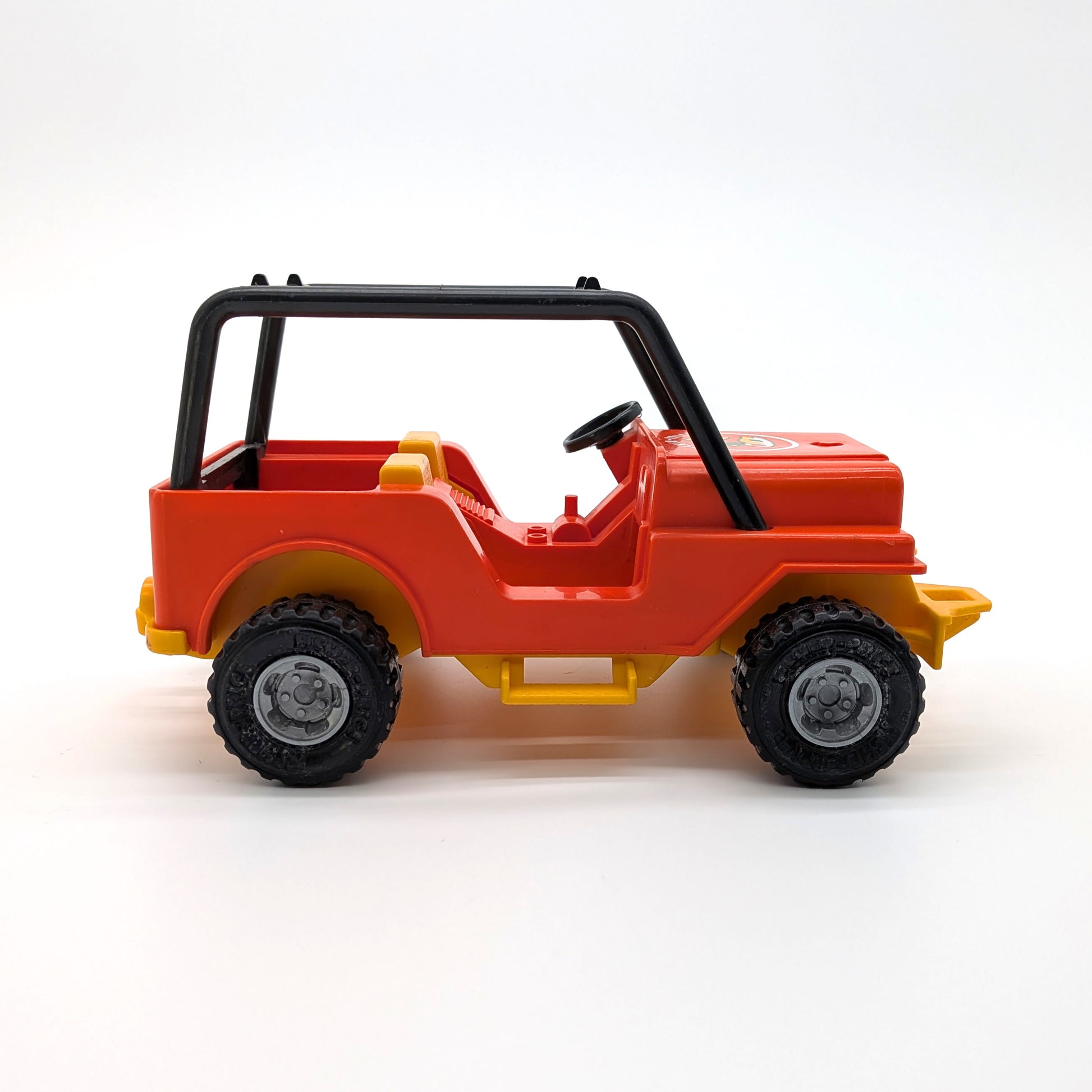 This vintage Fisher-Price Adventure People Orange Jeep from the #312 North Woods Trailblazer set is a classic piece of 1970s outdoor adventure play. Featuring a bright orange body with yellow seats, bumper, and sideboard, this rugged Jeep includes a black roll bar. The hood is decorated with a distinctive North Woods emblem, a white circle with a mallard duck and fish, adding to its charm. A perfect find for collectors or anyone looking to complete their Adventure People set, this Jeep captures the imagination and durability that made Fisher-Price toys so beloved.