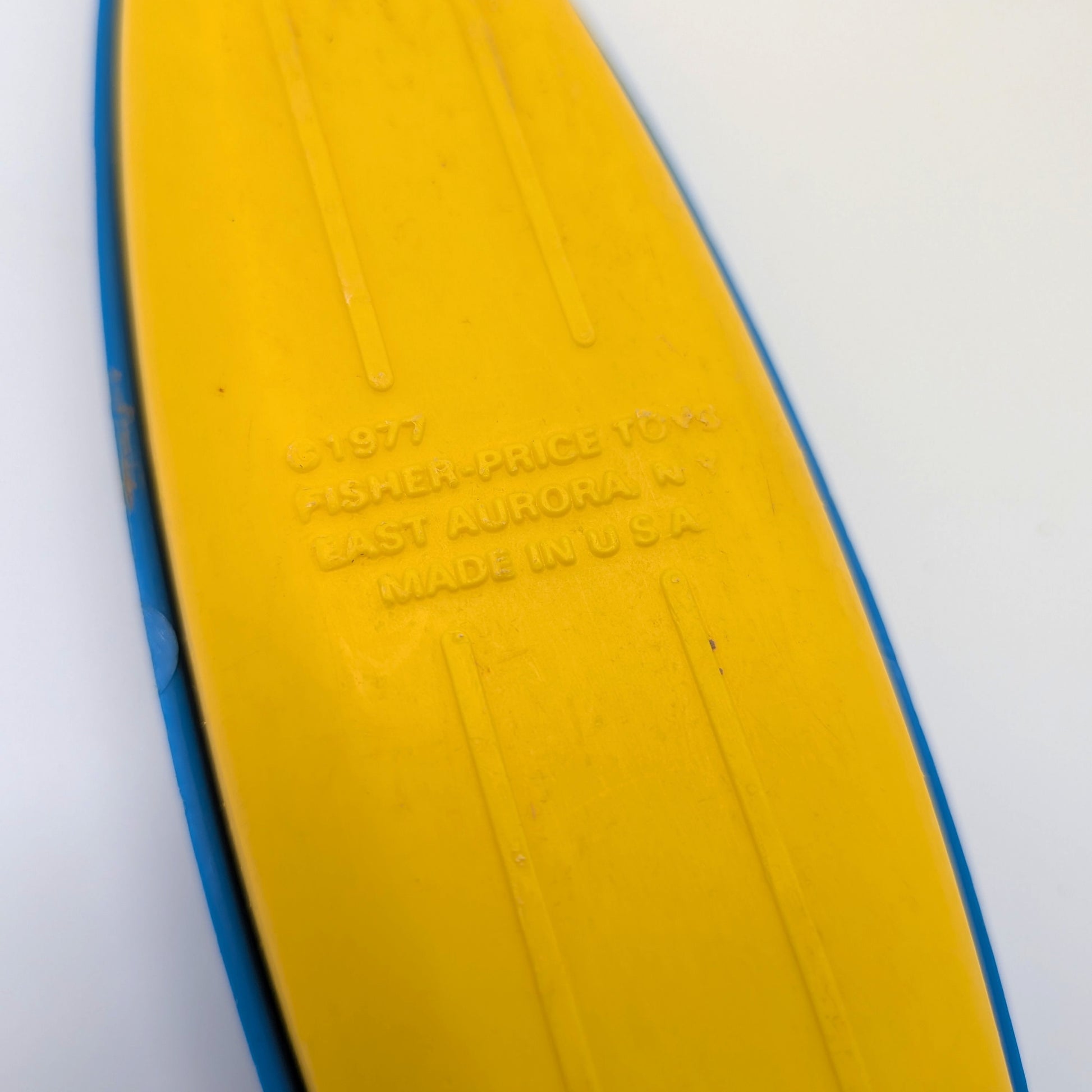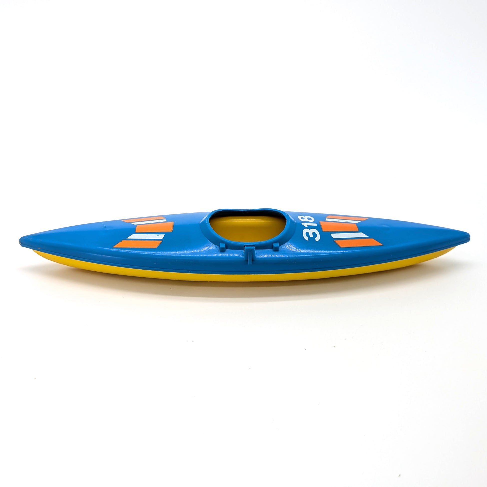 This vintage Fisher-Price Adventure Series kayak is a classic accessory from the #318 Daredevil Sport Van set. Featuring a blue top with a yellow bottom, this one-seat kayak is decorated with blue, white, and orange racing stripes and the number “318” on top. The molded side nook is designed to hold the kayak paddle, making it both functional and true to the original design. A perfect addition for collectors or those restoring their Adventure People sets.