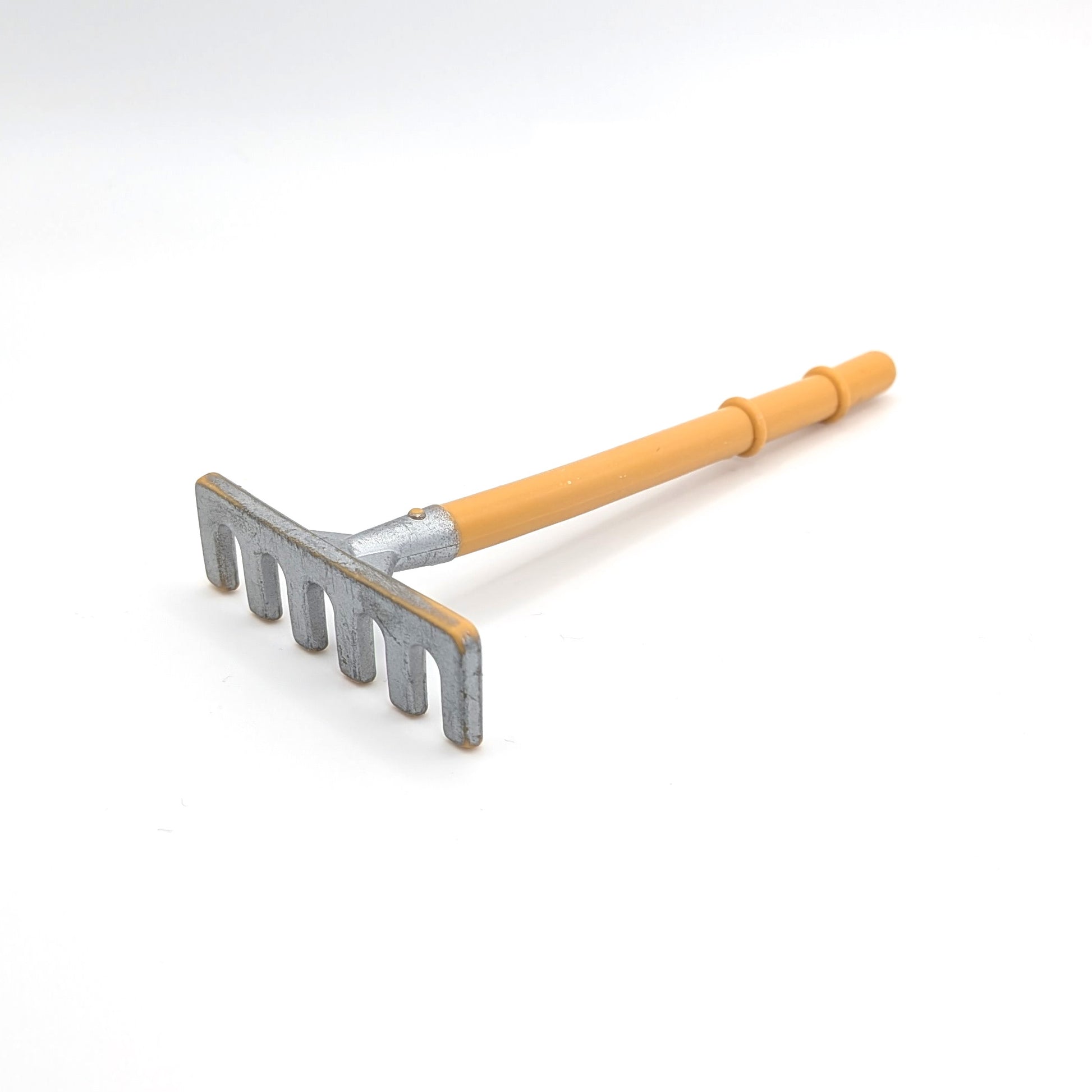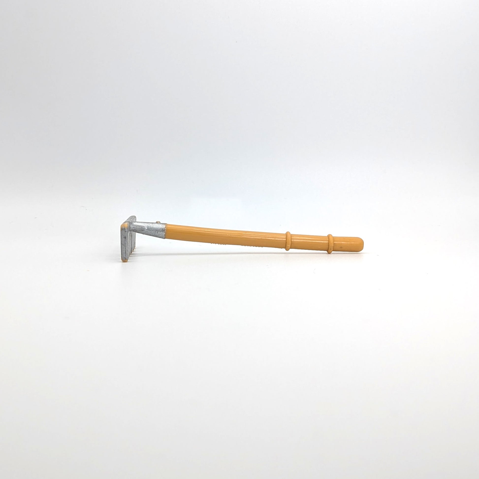 This vintage Fisher-Price Husky Helper Rake is an authentic accessory from the classic Construction Crew and Highway Dump Truck sets. It features a tan simulated-wood handle with two raised grip rings and a wide silver rake head with six detailed teeth, perfectly sized for Husky Helper figures. This sturdy plastic rake is a great piece for completing your set or adding a nostalgic, true-to-era touch to your vintage Fisher-Price Husky Helper collection.