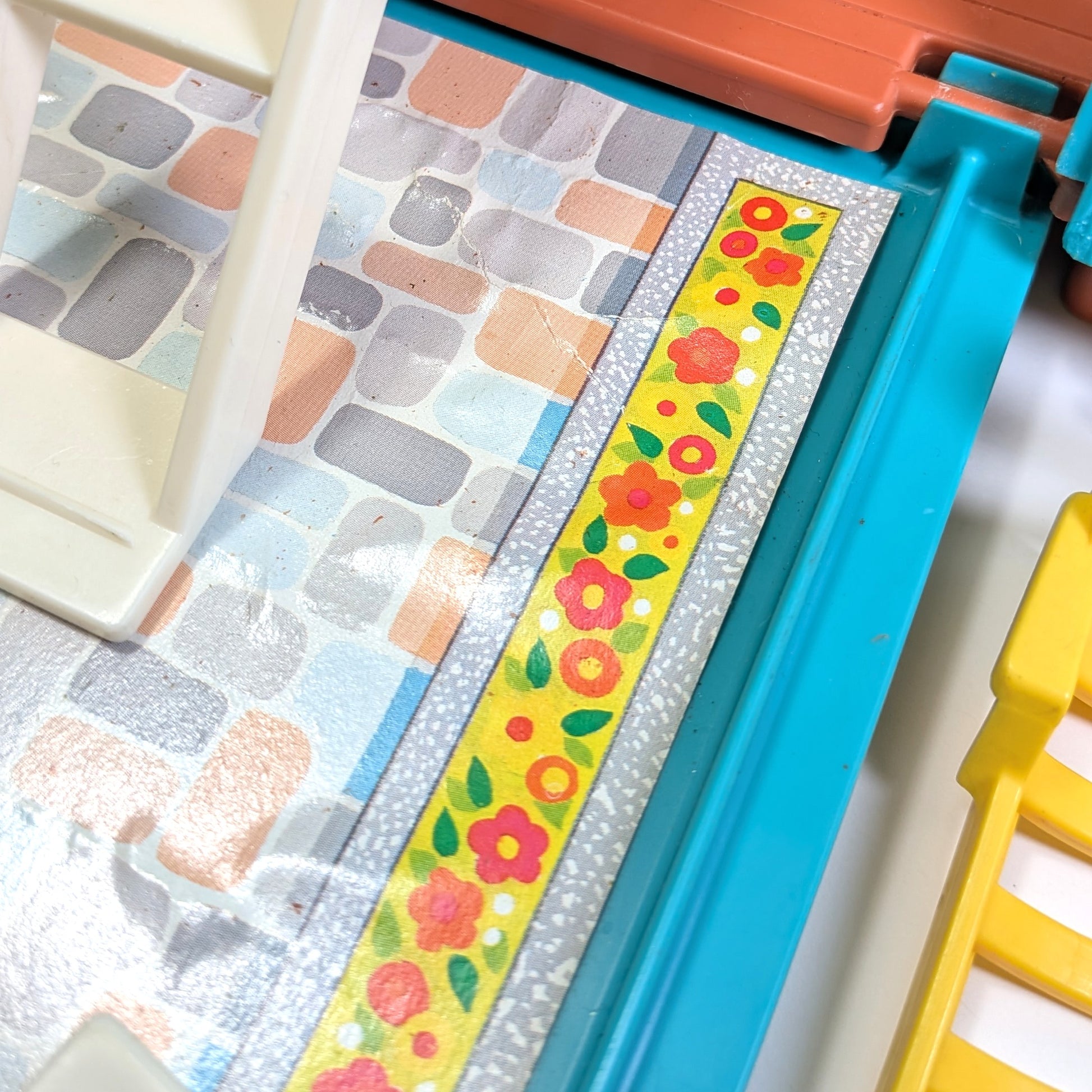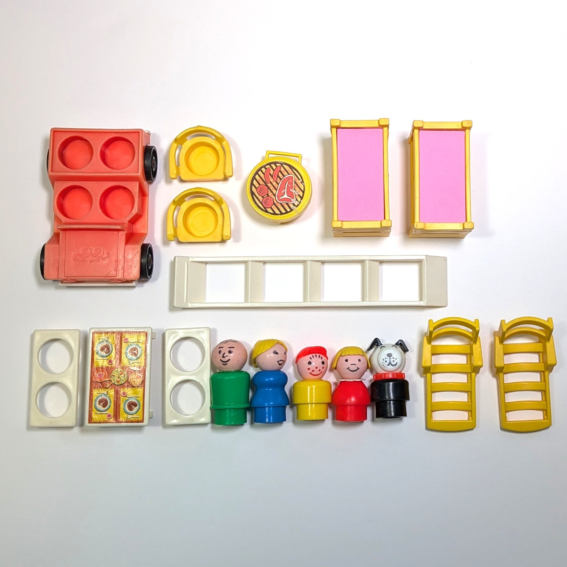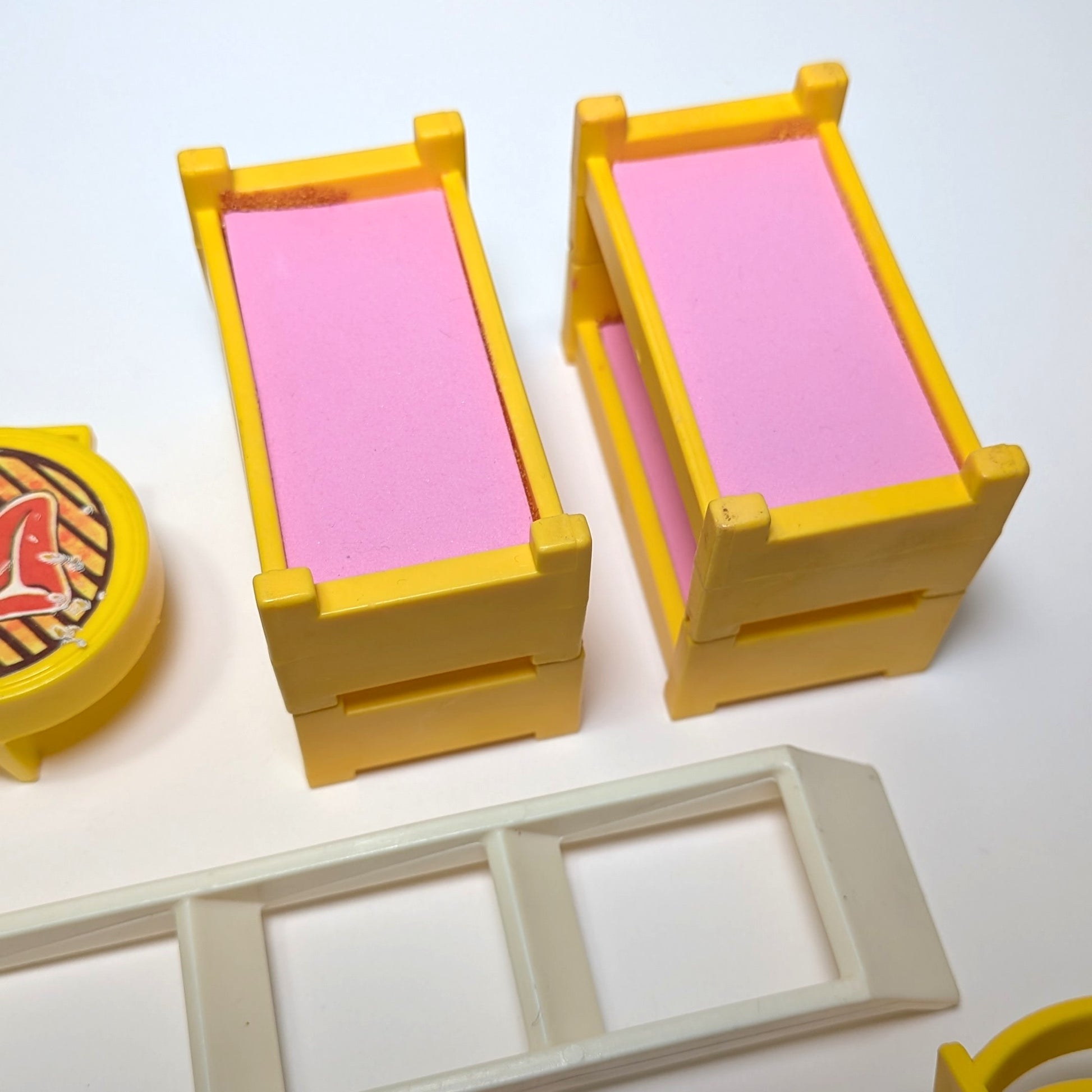 The set is in good, clean, used condition and has been well-loved over the years. The lithos do have some bubbling from age. The BBQ grill sticker has small marks (see photos). The car is quite faded but still looks great for display. The bunk beds include new replacement pink foam bedding. A nostalgic favorite and great addition for any Little People collection.