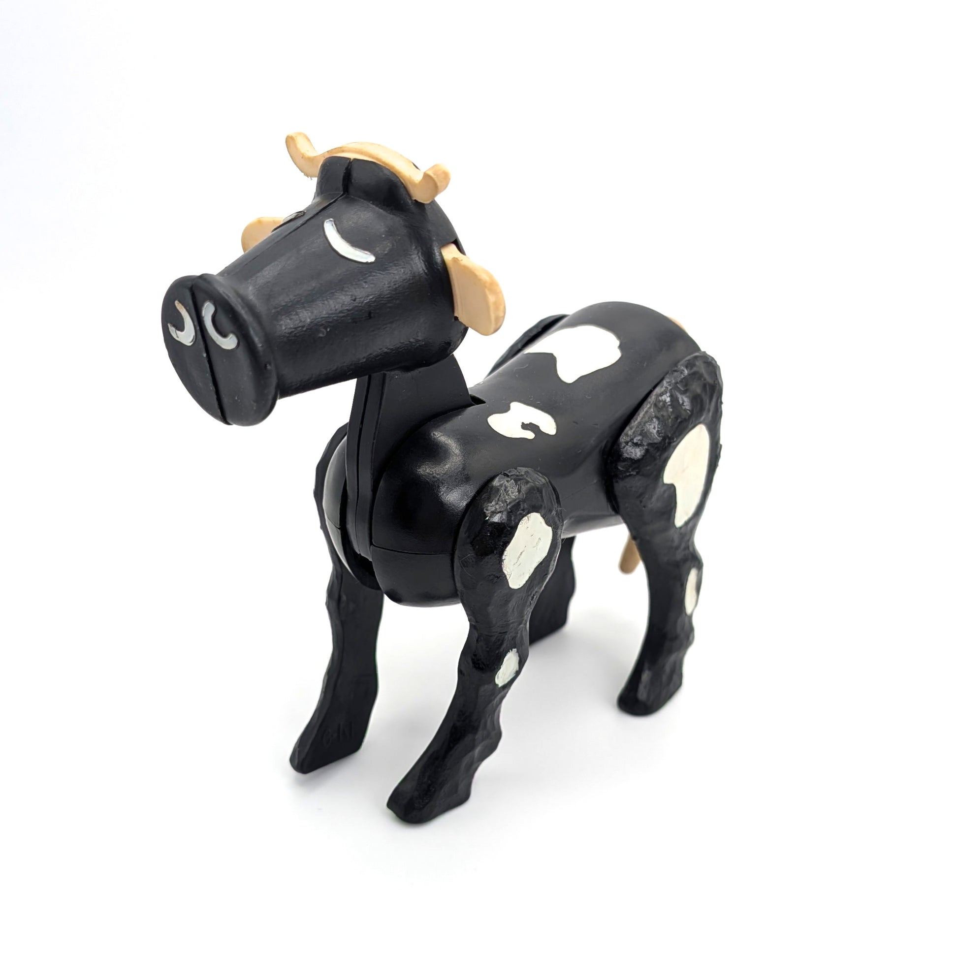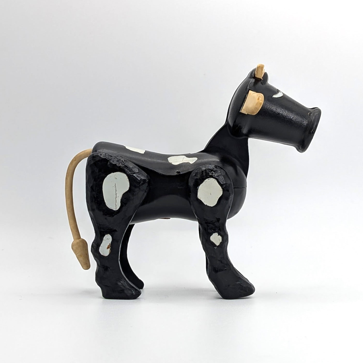 This is a rare and hard-to-find black color variation of Bossy the cow, originally included in the #915 Farm set. She features white downward-curved eyes, white horns and ears, and distinctive white spots on her back and legs. Her limbs and tail are jointed for classic poseable play, and her head tilts up and down. A unique addition for collectors looking to complete a truly vintage farmyard scene.