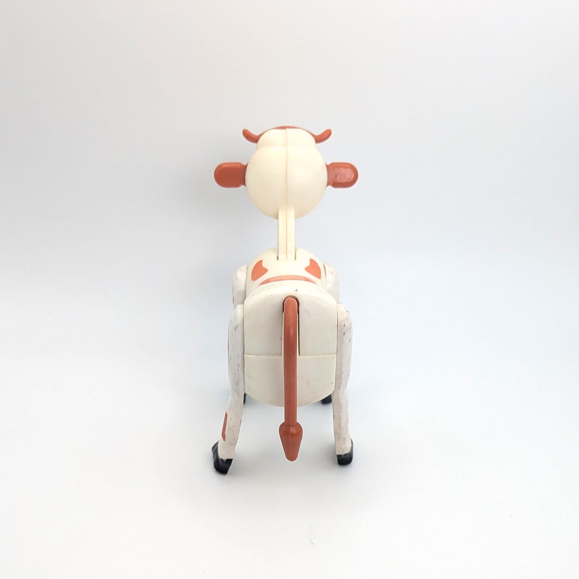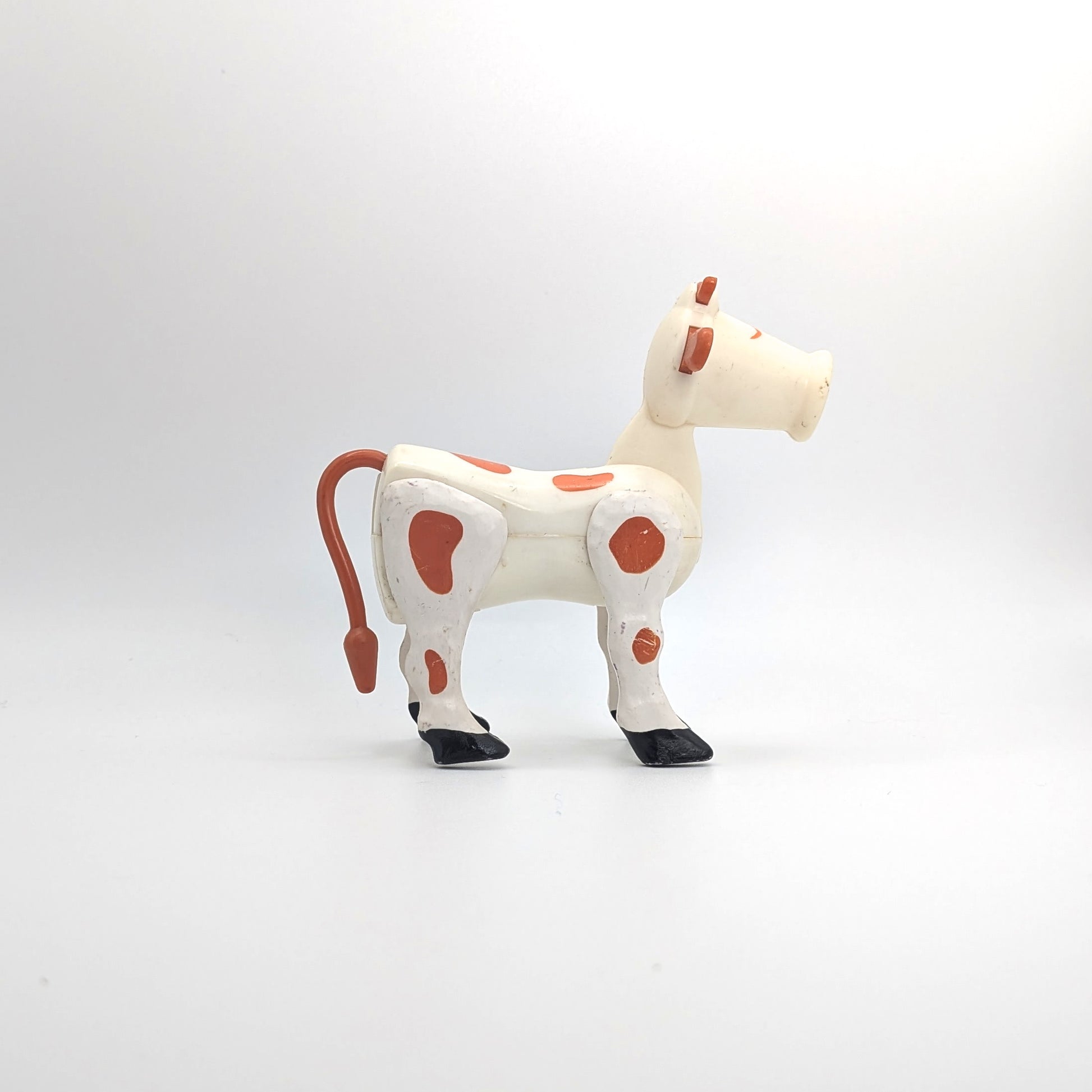 This classic Fisher-Price cow features a white body with brown spots, brown downward-curved eyes, and matching brown ears, horns, and movable tail. She has jointed arms and legs, head, and sturdy black hooves for barnyard adventures. Originally included in sets like #686 Animal Pals Cow, #699 Animal Pals Assortment, #910 Fisher-Price Farm, and #915 Farm from the late 1970s into the 1980s, this charming cow brings a touch of nostalgia to any vintage collection.