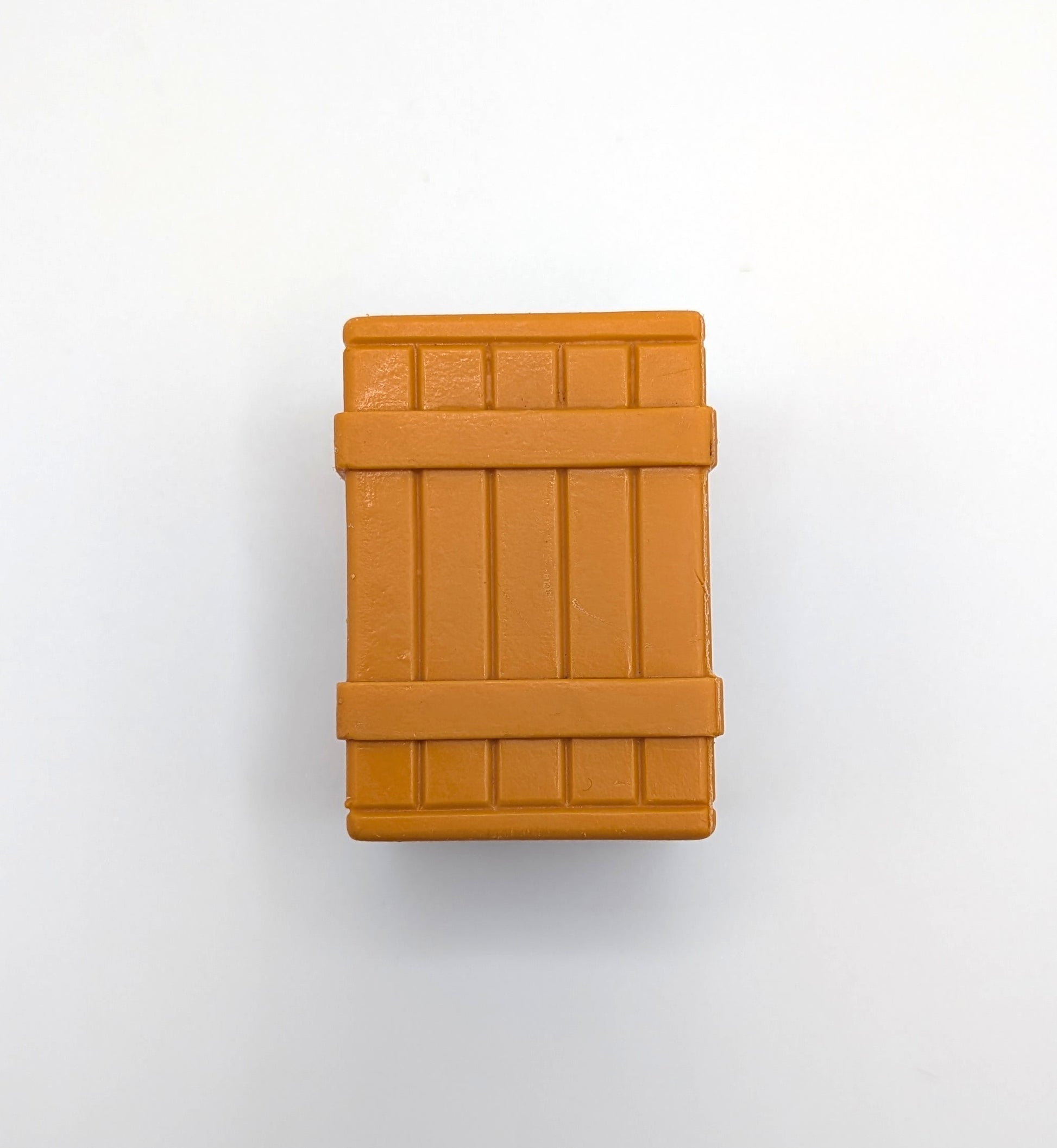 Orangish-brown rectangular plastic crate with molded “wood-slat” detailing, including five vertical boards and two horizontal support boards on each side. The crate features a diagonal seam across the top and bottom and was made without a hook on top. Originally included in several playsets, such as the #942 Lift & Load Depot, #2351 Little People Mini-Sets Assortment, #2352 Little People Construction Set, and #2449 Air Lift Copter. A versatile accessory piece perfect for completing vintage sets or enhancing your Little People collection.