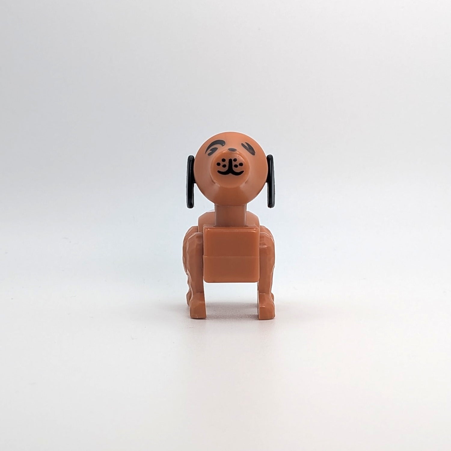 Bring a touch of vintage charm to your Fisher-Price farm collection with this classic Original Little People dog, often known as Spot. This light brown pup features black ears and tail, black painted facial features, and white spots on his body. Designed with four jointed legs and a head that swivels side to side, Spot adds personality and nostalgia to any #915 Farm playset. A beloved companion piece that completes your retro display beautifully.
