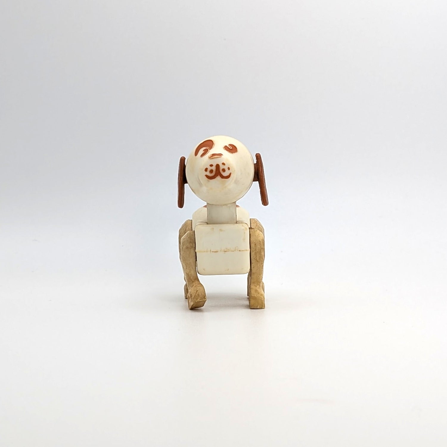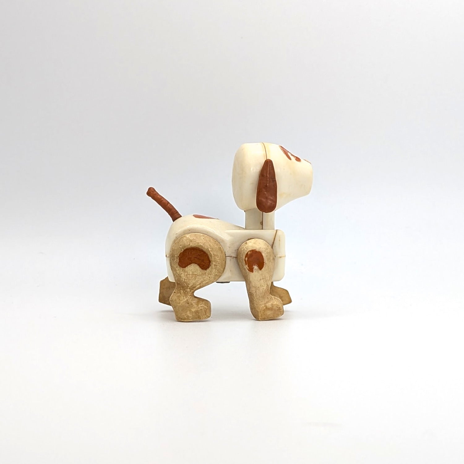 This rare white variation of the Original Little People dog, often called Spot, is a standout addition to any vintage Fisher-Price #915 Farm set. Featuring brown ears, tail, and facial features with brown spots on a white body, this charming pup has four jointed legs and a head that swivels side to side. Harder to find than the more common versions, this early color combo adds nostalgic character and collectible appeal to your Little People display.