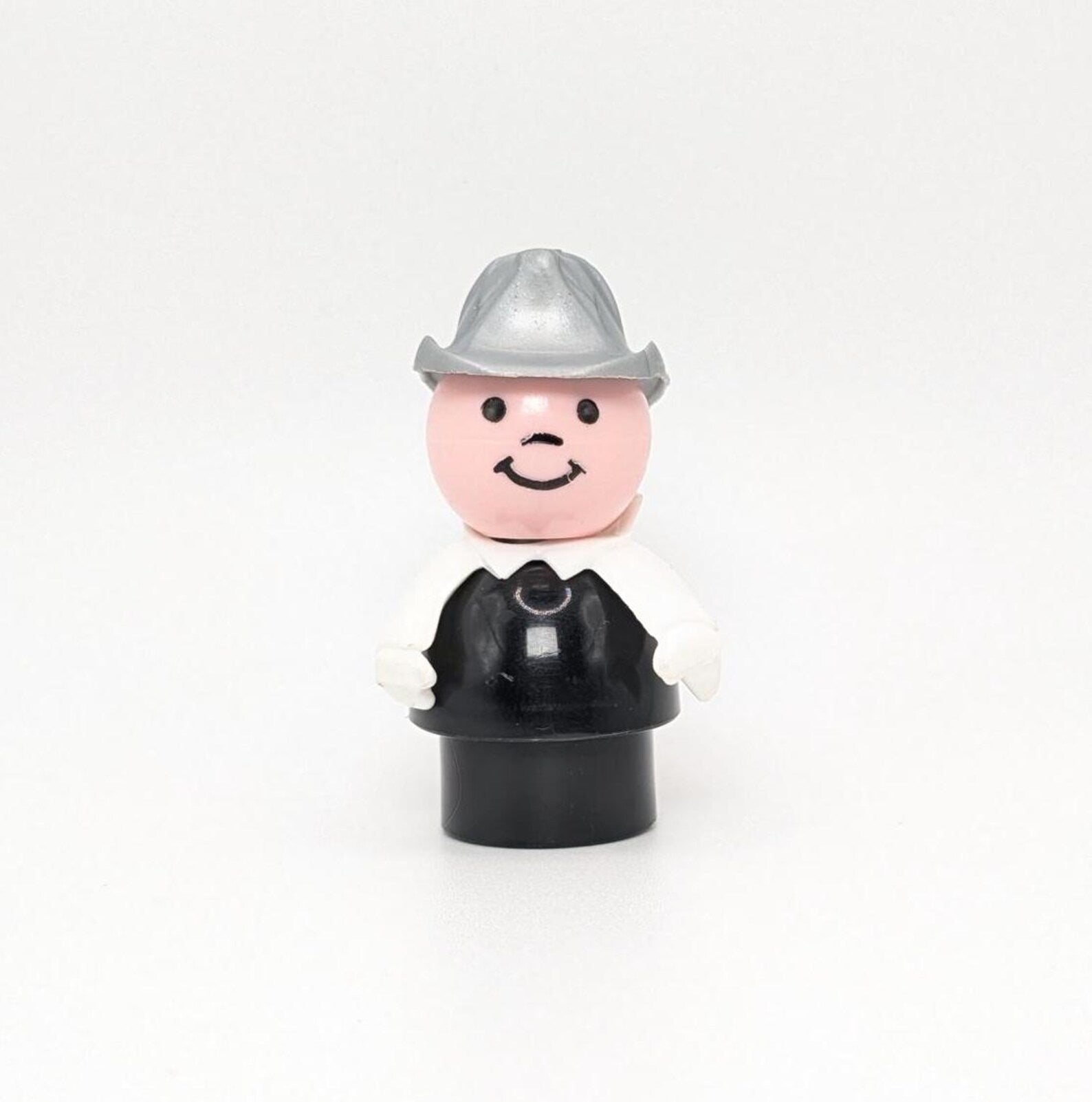 This original Fisher-Price Little People fireman wears a silver helmet and features a black body with molded white arms designed to hold firehoses. With a white collar and cheerful expression, this short all-plastic figure is a harder-to-find variation. He was included in sets like #346 Fire Engine Rig, #396 Little Truck Rigs Assortment, and #2351 Mini-Sets Assortment. A great piece to add vintage flair to any classic Fisher-Price collection.