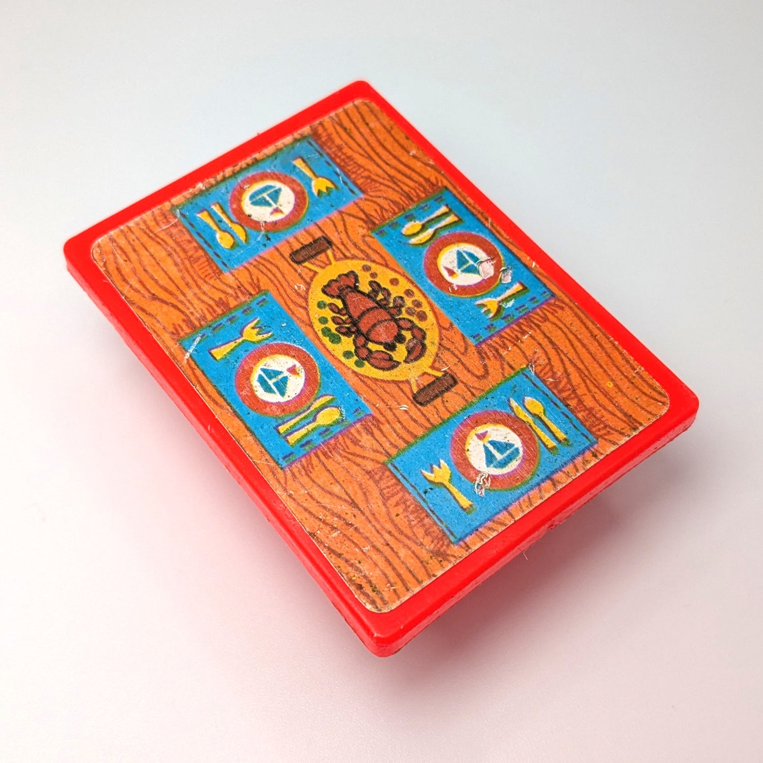 Designed for the #985 Play Family Houseboat, this red rectangular picnic table features a whimsical four-place lobster dinner litho on top. With its sturdy X shaped leg and playful nautical charm, it adds a touch of retro imagination to any Fisher-Price Little People display.