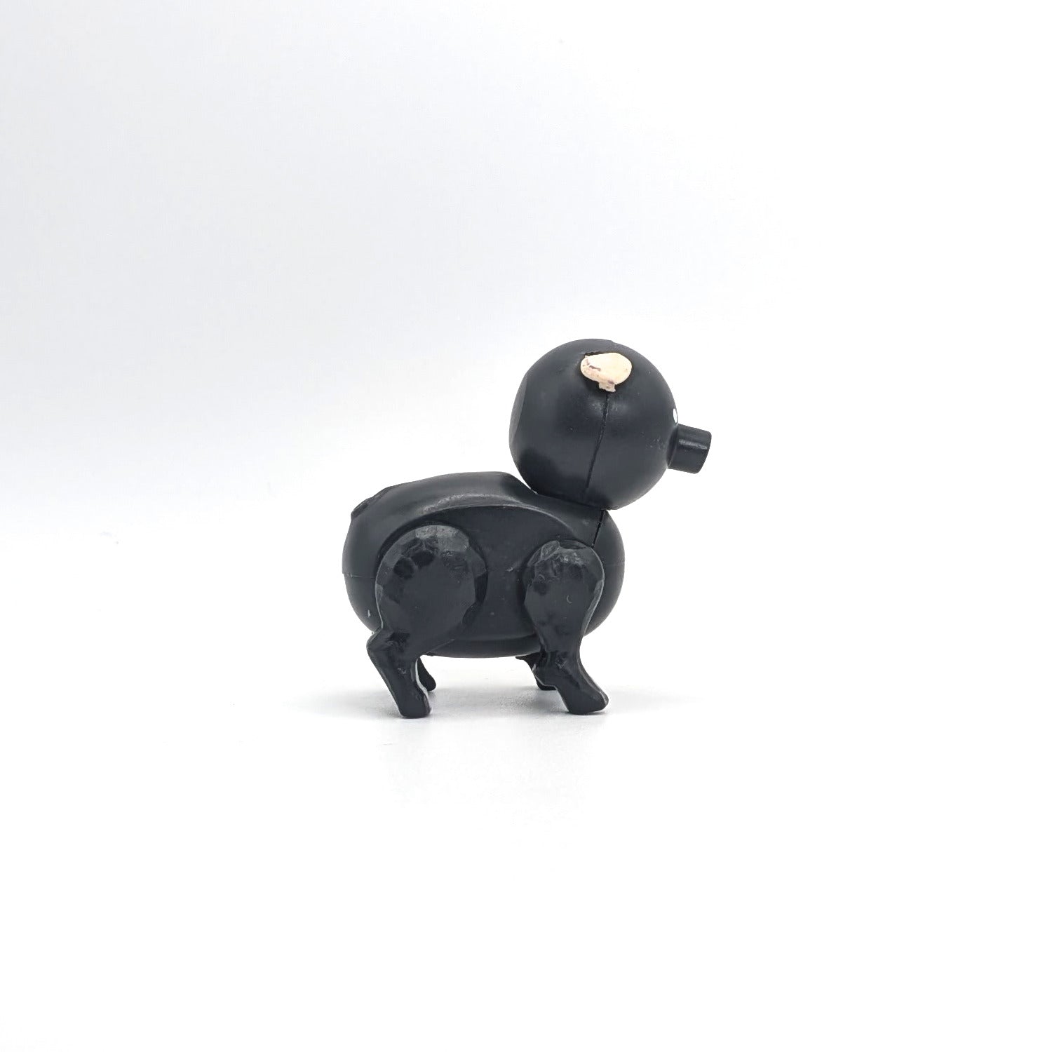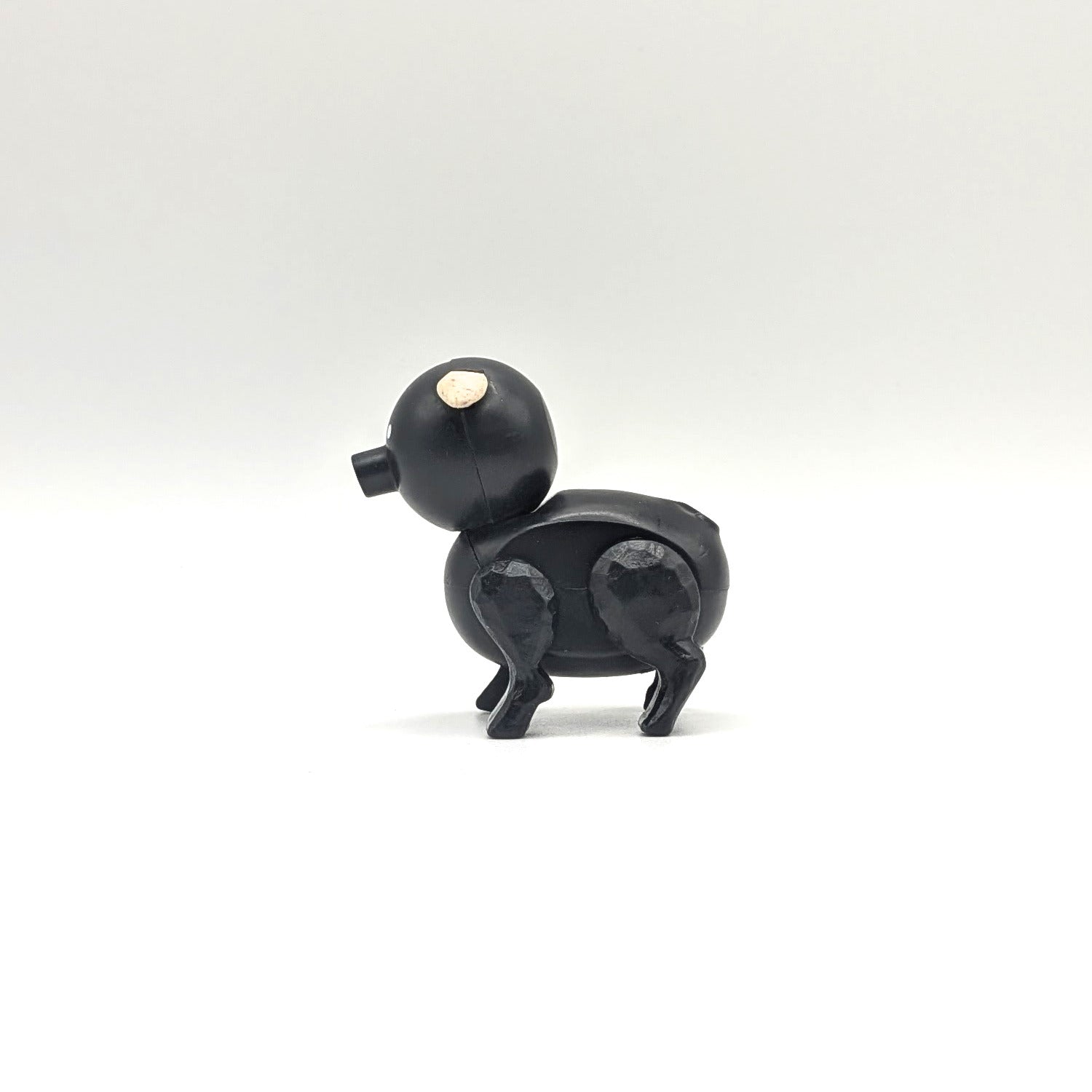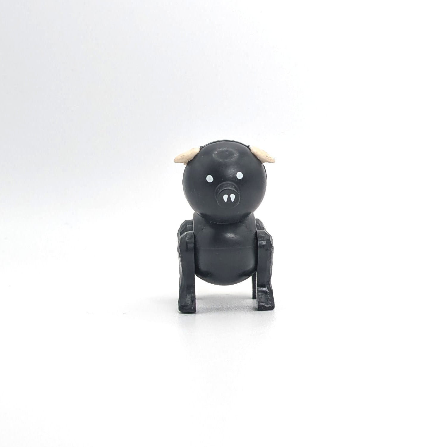 This vintage Fisher-Price pig features a black body with distinctive white ears, poseable legs, and a movable head. A classic addition to the Little People farm series, this pig adds nostalgic charm and variety to any old-fashioned barnyard collection.