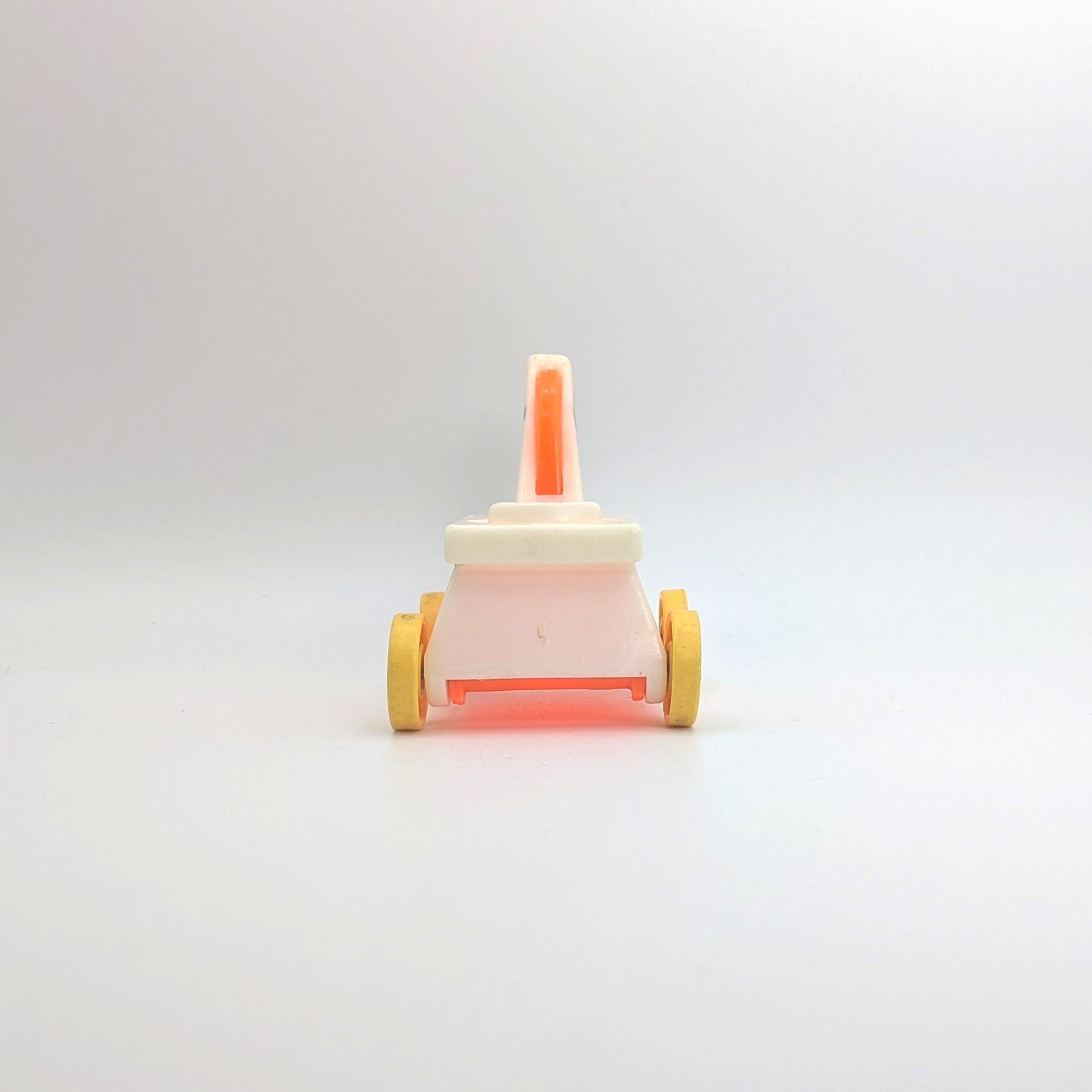 This vintage orange riding horse toy features a white horse head with black eyes and orange mane, mounted on four small yellow wheels. Originally part of the #656 Little Riders playset, this rolling horse brings retro playtime nostalgia and classic collectible appeal to your Fisher‑Price world.