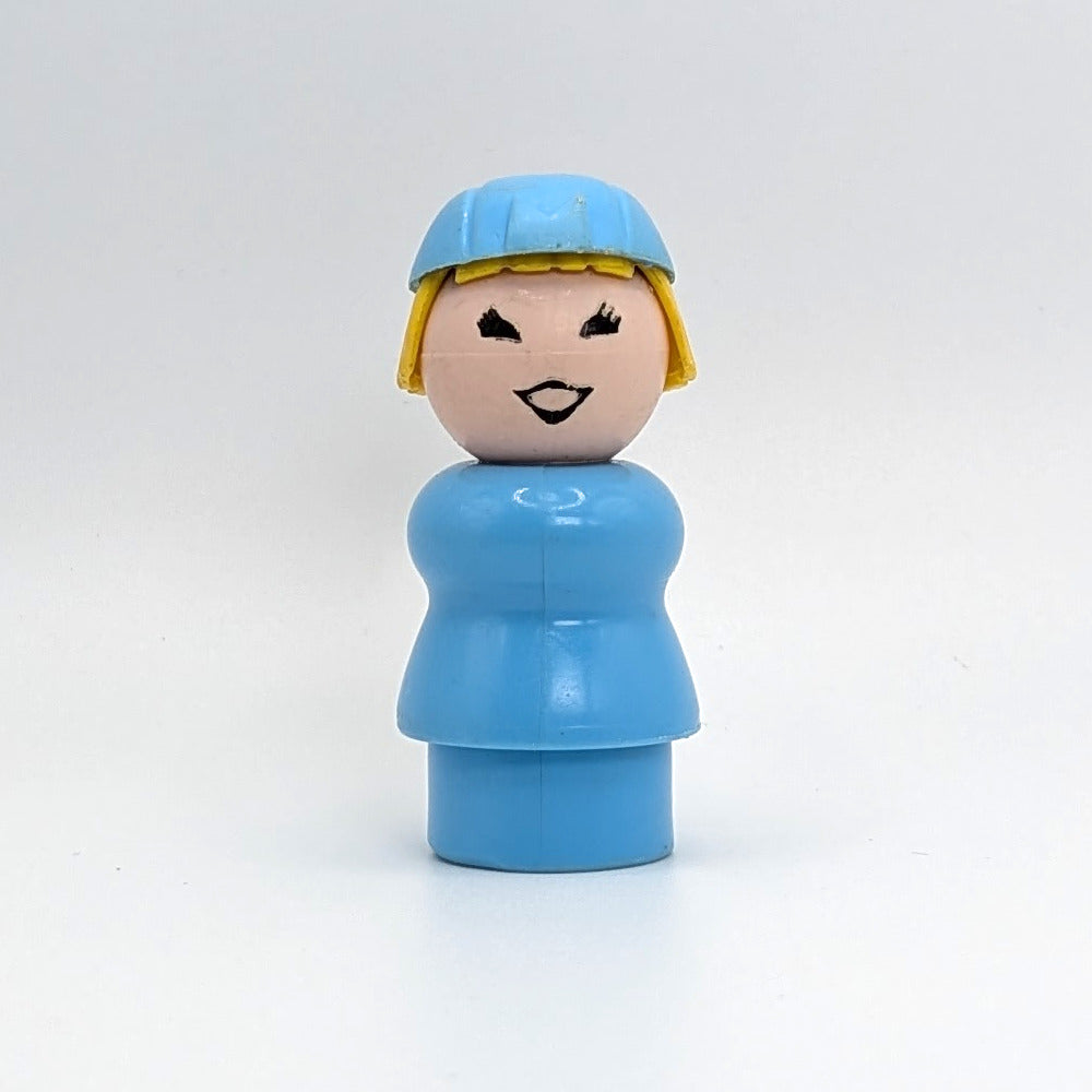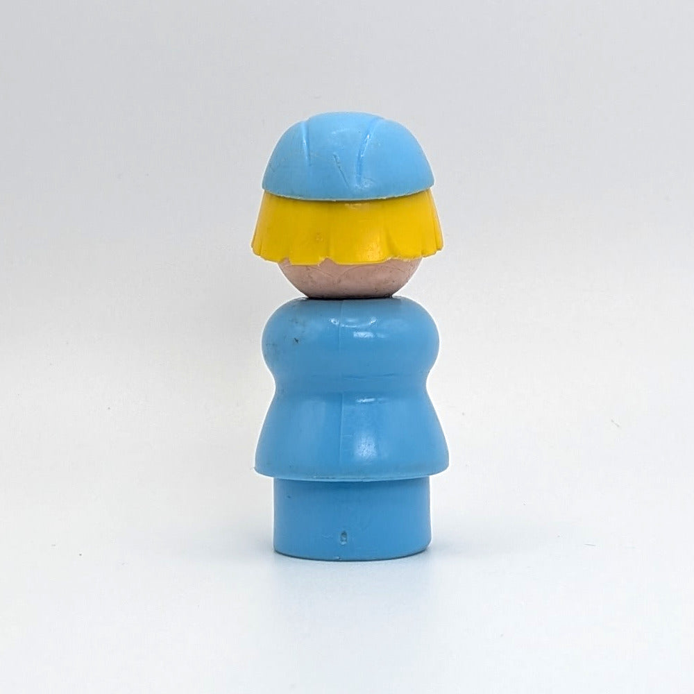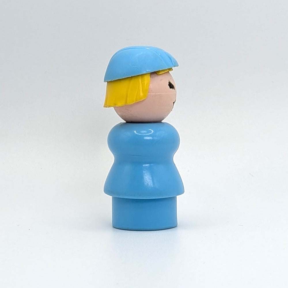 This vintage Fisher-Price Little People stewardess wears a light blue body and matching cap with an M-shape on the front, plus a white scalloped collar. With her blonde hair and classic airline look, she flew into sets like #678 Airport Crew, #680 Little People Assortment, and #2502 Airport. A charming piece that captures the nostalgia of retro imagination toys and happy childhood play.
