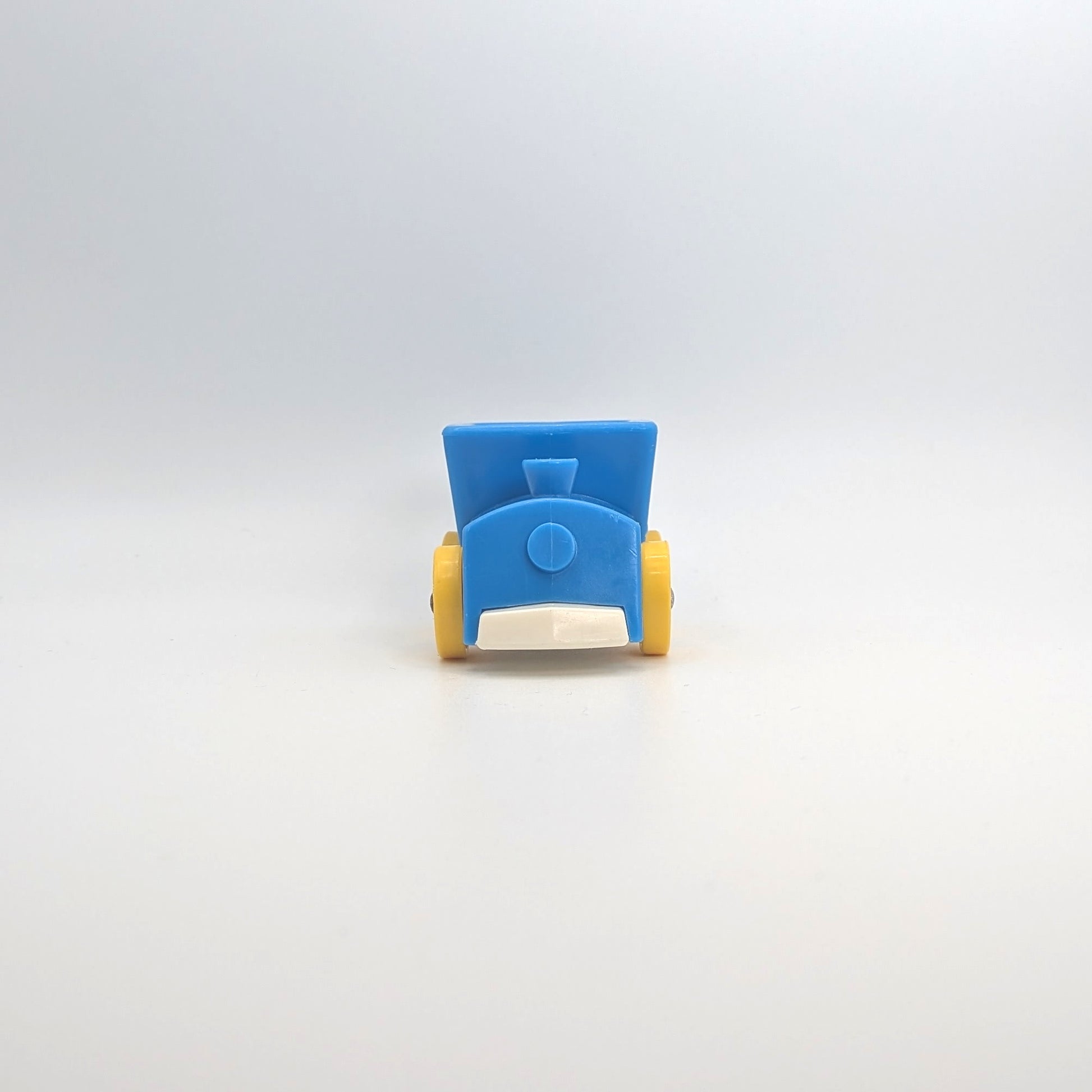 This vintage blue Fisher-Price Little People train engine features a single seat, a white base and front bumper, and a small round smokestack on top. Rolling on four small yellow wheels, it's the perfect size for a classic Little People figure to ride along. Originally included with the #656 Play Family Little Riders set, this cheerful engine adds retro charm and happy memories to any vintage toy collection.