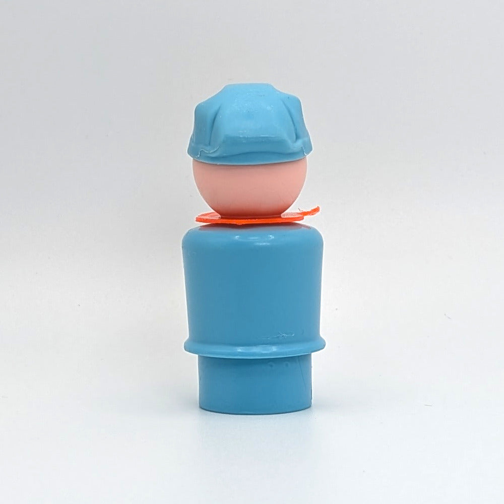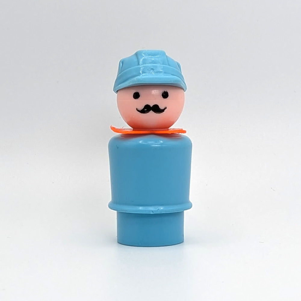 This vintage Fisher-Price Little People figure has a light blue plastic body and wears a matching angled-style engineer hat. His simple dot eyes and thin mustache give him a friendly, classic look, and his orange farmer-style scarf adds a splash of retro charm. This short-style figure was included in the #991 Circus Train and #2581 Express Train playsets. A nostalgic favorite for train lovers and vintage toy collectors alike.