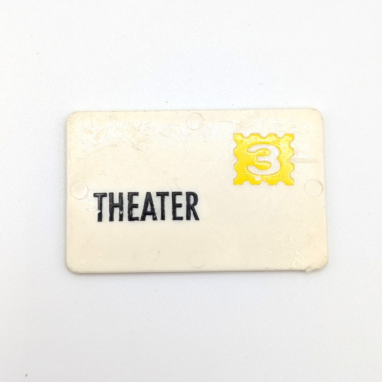 This hard-to-find vintage mail piece is from the Fisher‑Price Village set #997. Made of white plastic with “3 and Theater” stenciled in black and yellow, it fits into the storefront mail slots and the back of the mail truck. A great way to complete your display with an authentic accessory from this nostalgic playset.
