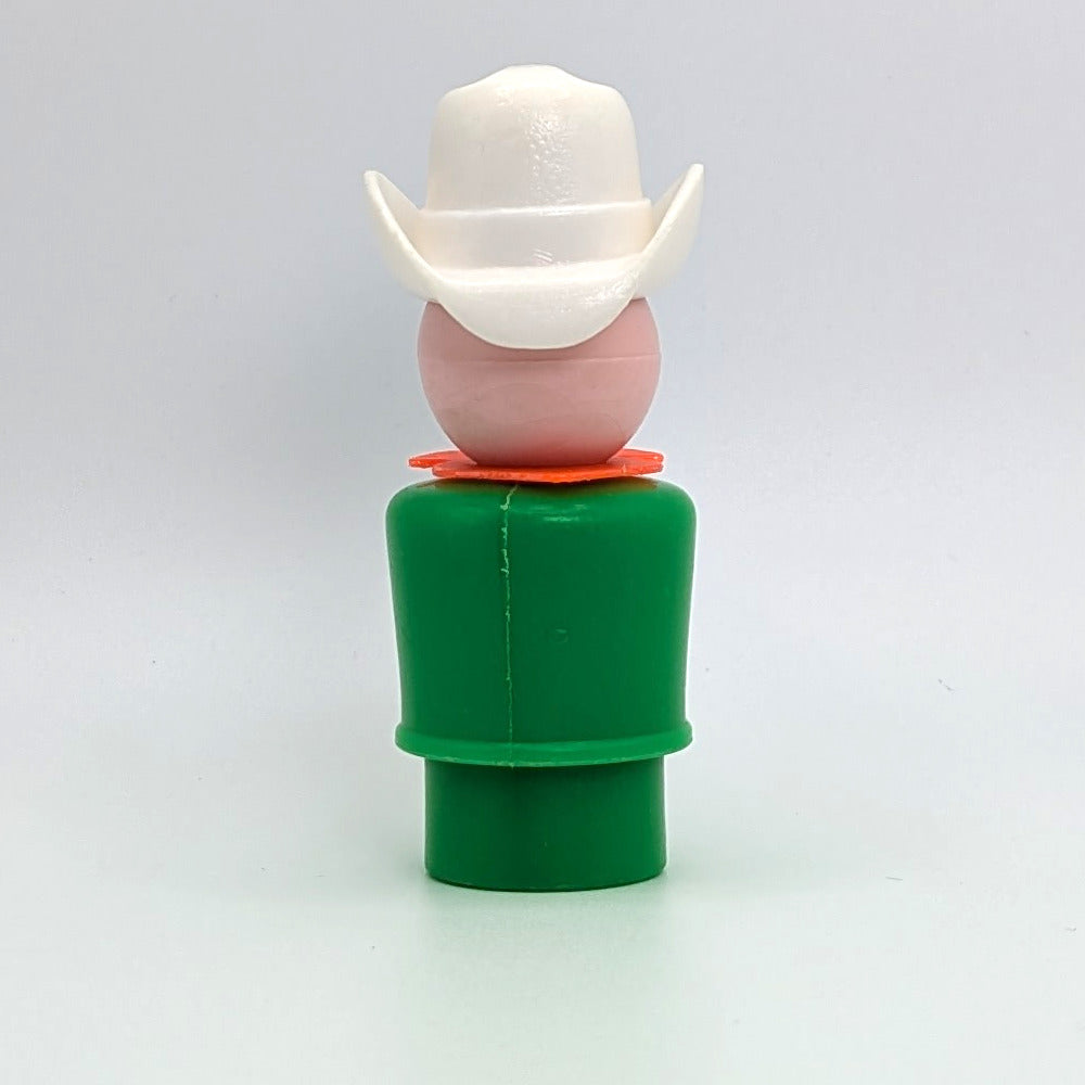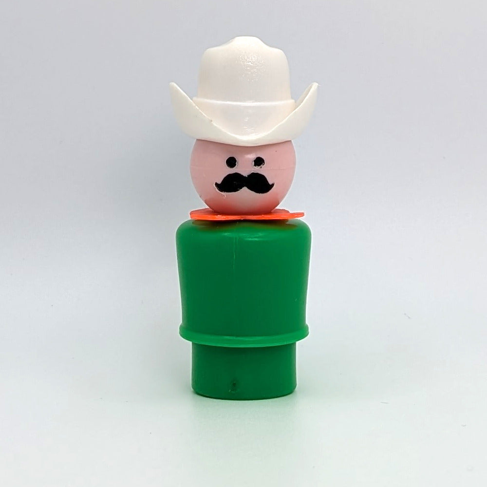 This Fisher-Price Little People figure features a green plastic body, thick black mustache, and a bold Western look. He wears a tall white 10-gallon cowboy hat and an orange farmer-style scarf tied around his neck. Included in the #676 Westerners and #680 Little People Assortment playsets, he brings classic cowboy charm to any vintage roundup.