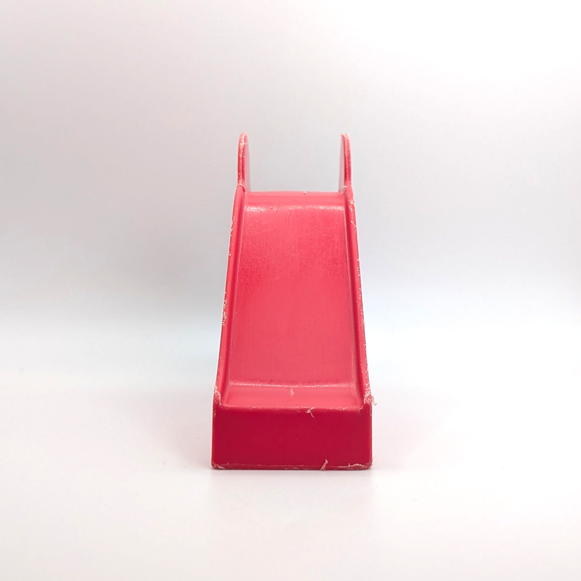 This vintage Playskool Familiar Places red sliding board features three steps with raised arm-rails on the sides and rounded rails along the top step, designed for safe and fun play. Originally included in the #480 Holiday Inn playset, this classic piece is perfect for collectors restoring or completing their set, or adding a nostalgic 1970s touch to a Playskool display.