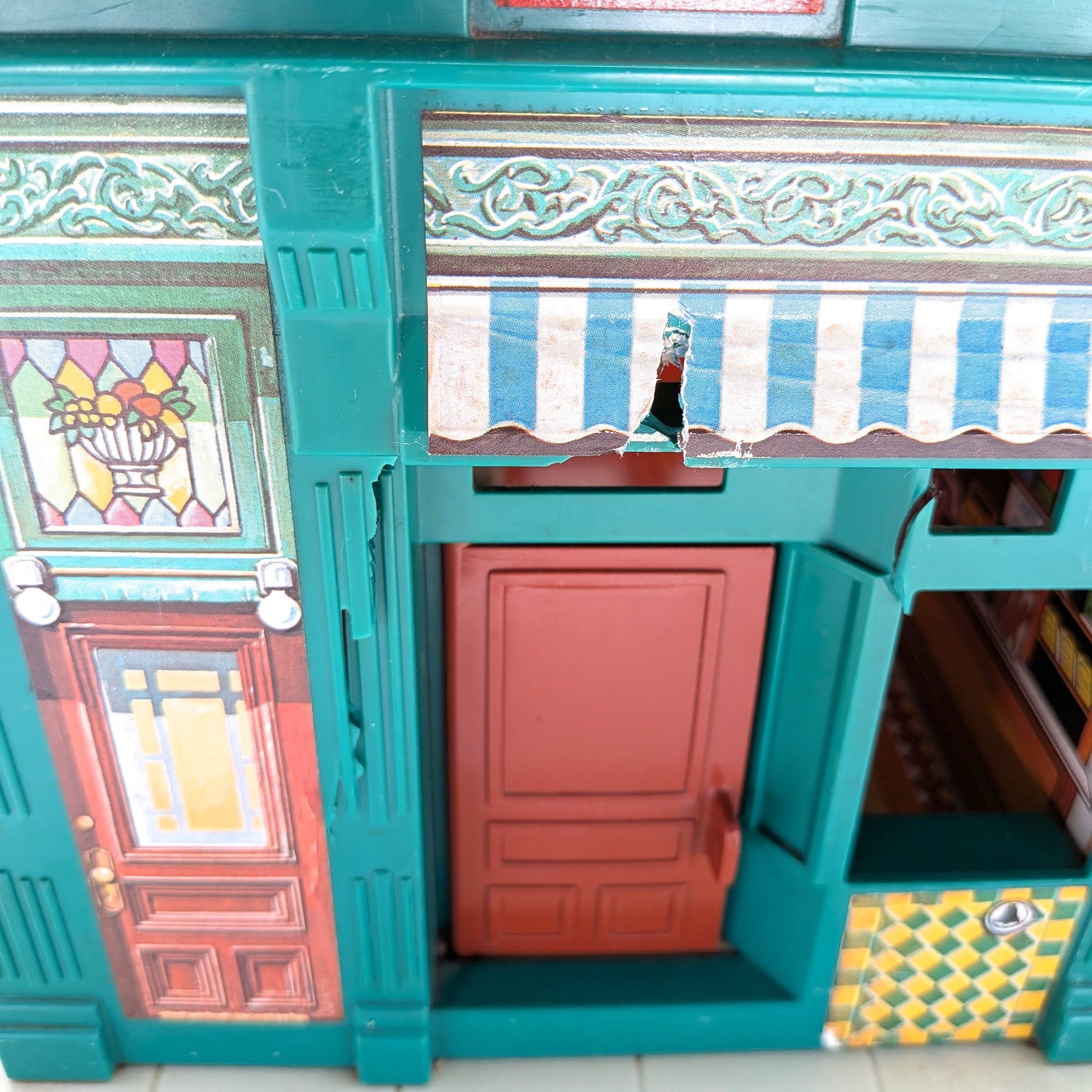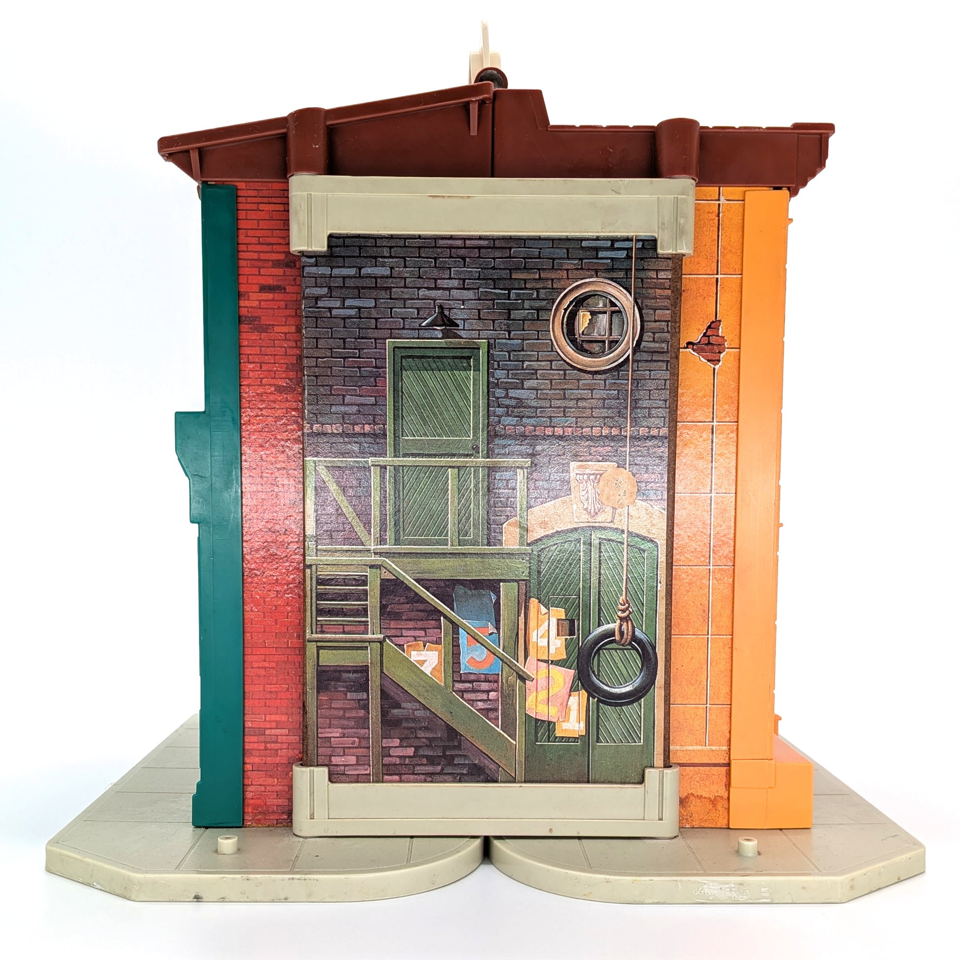 This set is nearly complete and original, with every accessory included except the chalk and eraser. There is a small piece missing from the roof, a crack/damage on the front door facade building, and two spots on the floor in Bert and Ernie’s room. Please see all photos for details.